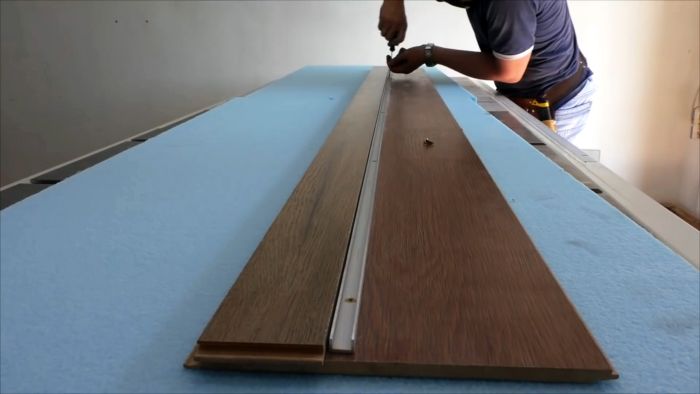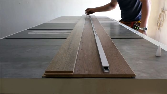 Наносим на тыльную поверхность узкой заготовки из ламината клей, прижимаем к основанию по длине алюминиевый швеллер в качестве ограничителя и приклеиваем узкую заготовку к основанию вдоль алюминиевого швеллера.