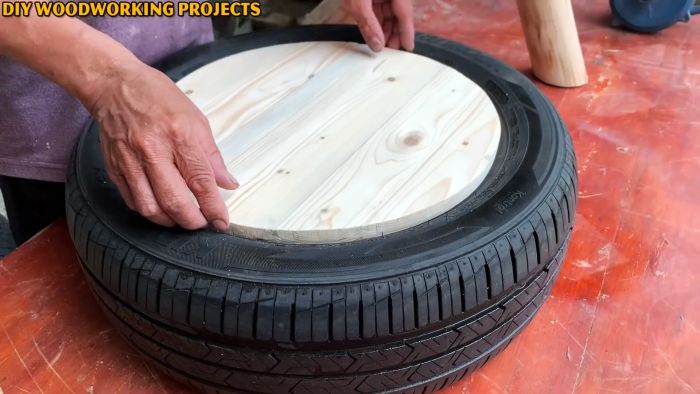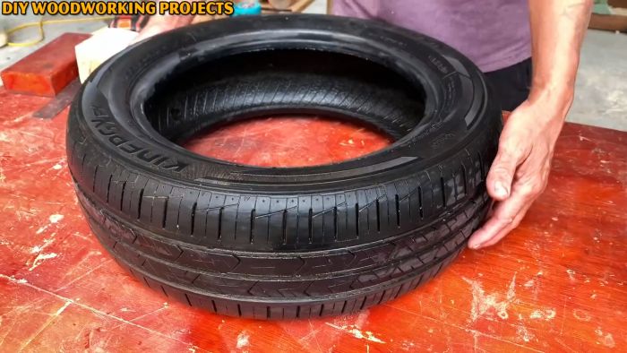 Нужно подготовить две старые шины – одну от автомобиля, вторую от мотоцикла. Автомобильная шина пойдёт на сиденье, мотоциклетная шина будет использоваться в качестве спинки.