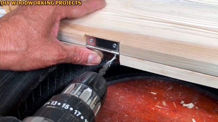 Готовое сиденье крепится к основанию кресла с помощью шурупов и шуруповёрта, открывающаяся ниша устанавливается сверху. Крепление идёт в районе крестового соединения заготовок-основ для кресла.