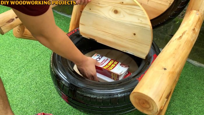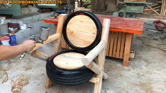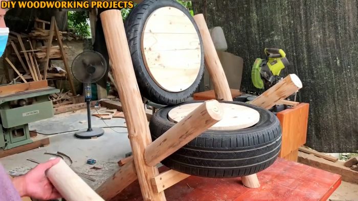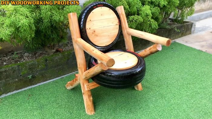 Из ненужных досок, брёвен и старых покрышек можно сделать прекрасное кресло ручной работы, для этого нужно только желание и набор инструментов. Такое кресло отлично будет смотреться как на заднем дворе, так и в саду. А благодаря амортизирующим свойством покрышек сидеть на нем будет очень удобно.