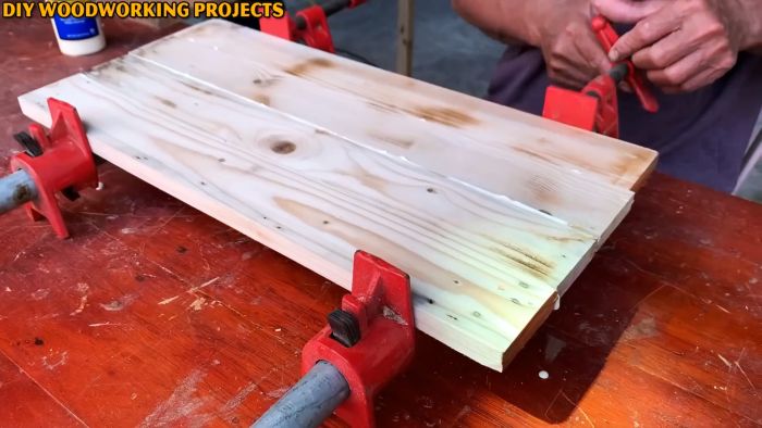 Фрезерованные доски промазываются в пазах и на шипах клеем ПВА, потом соединяются друг с другом и фиксируются струбциной для лучшего склеивания.