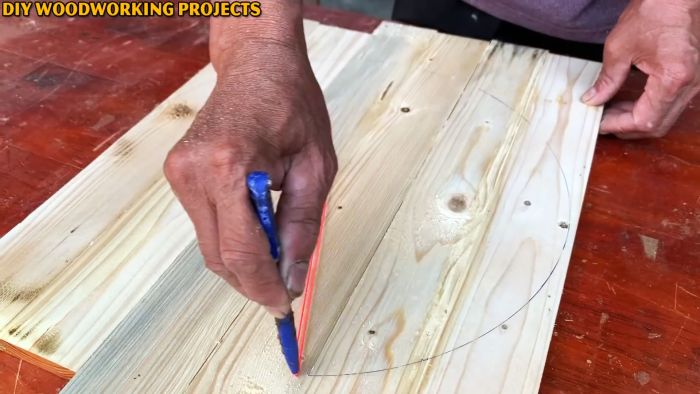 Когда щиты высохнут, они размечаются на круглые заготовки-основания. Для того, чтобы начертить ровные круги, используется гвоздик с верёвочкой определённой длинны.