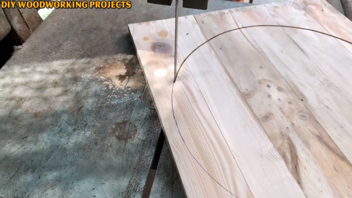 Доски нужно соединить в цельные щиты. Ненужные доски фрезеруются на станке для изготовления соединения типа «паз-гребень». Нужно изготовить несколько щитов, чтобы вырезать из них три круглых основания для сиденья и спинки и одно круглое основание из двух половинок, чтобы сделать в сиденье нишу для хранения всяких мелочей. Все основания должны быть одинаковые по размеру.