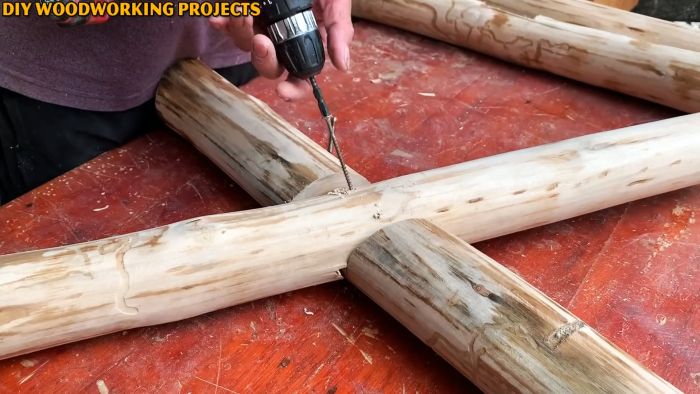 Спинка устанавливается проще – она крепится саморезами между двумя выступающими концами длинных брёвен.