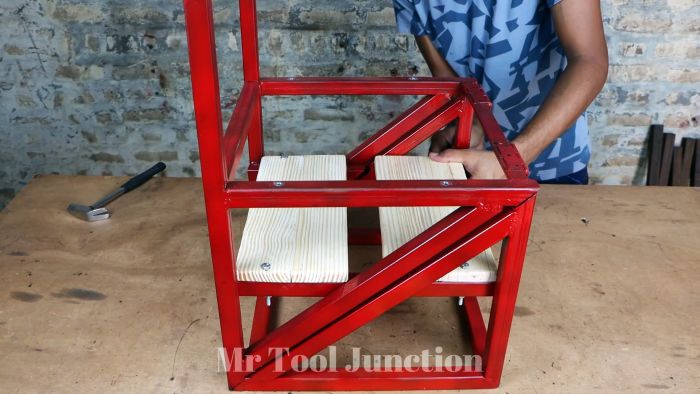Каркас стула изготавливается из профильной трубы. Он может иметь любой удобный для вас размер. В данном случае высота ножек делается 32 см. Для каркаса нужно будет сварить две Р-образные детали, где длинная труба будет служить опорой спинки. Желательно, чтобы высота спинки была такой же, как и ножек, но не меньше. В таком случае последняя ступень лестницы получается горизонтальной во всех плоскостях.
