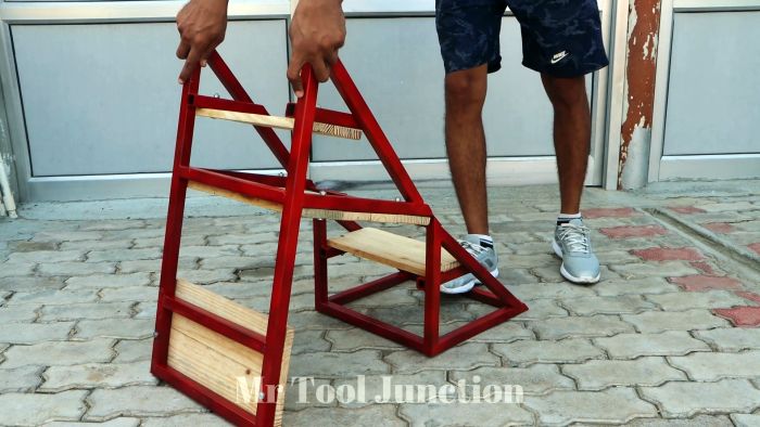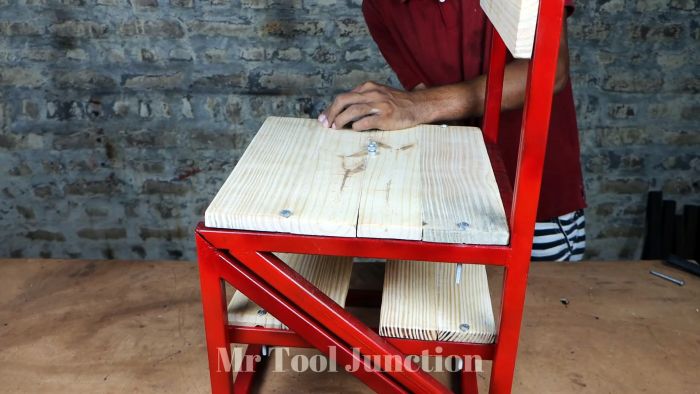Полученный стул при опрокидывании половины на петлях превращается в лестницу с тремя ступенями. Обратите внимание, что на вторую и третью приходится вставать с обратной стороны, то есть они удерживают вес человека только за счет болтов. Это нужно учитывать, и использовать крепкие доски и надежные болты с шайбами.