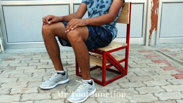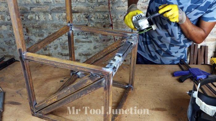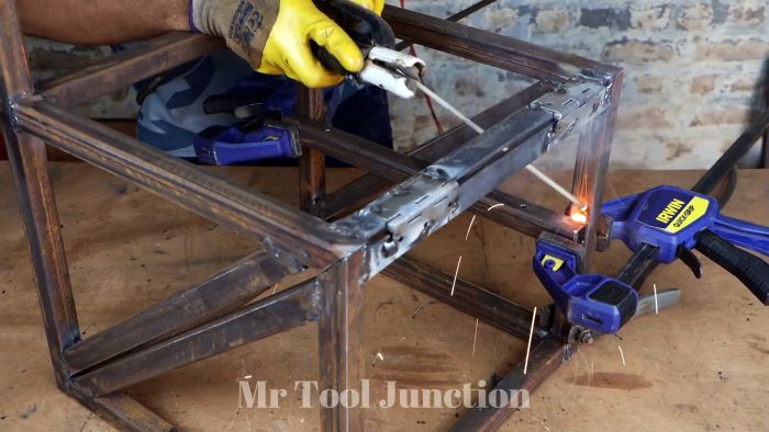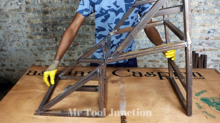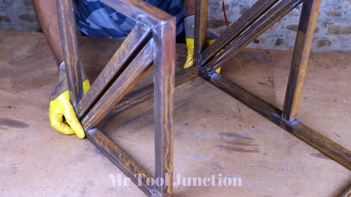 На ножки стула приваривается 2 перемычки из трубы. Их нужно будет разрезать между диагональными вставками, чтобы конструкция снова могла открываться. После этого каркас можно покрасить.