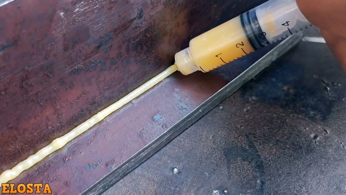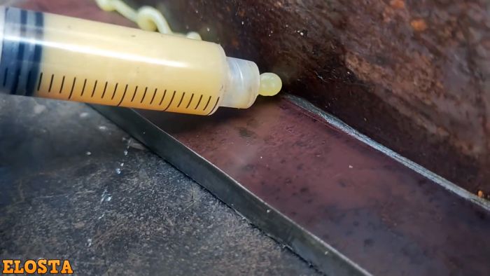Задача обучения – добиться, чтобы гель выдавливался аккуратной «колбаской» и ложился между свариваемыми деталями. Достичь этого можно, если вести шприц под небольшим углом, чтобы кончик отставал.