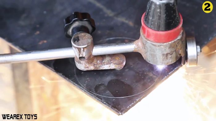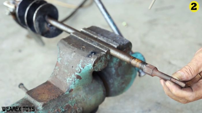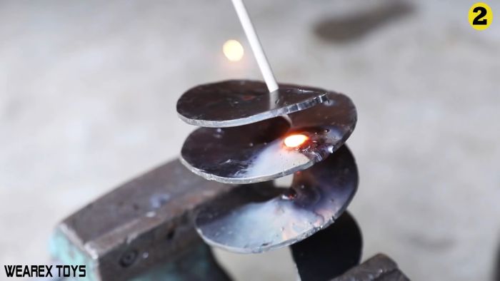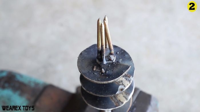На следующем этапе заготовки свариваются в шнек. Затем его нужно заточить. После этого в шнек вваривается пруток или шпилька.