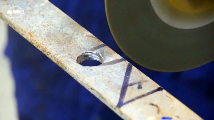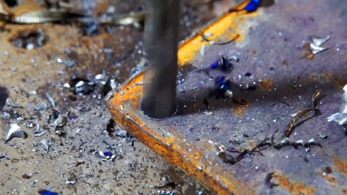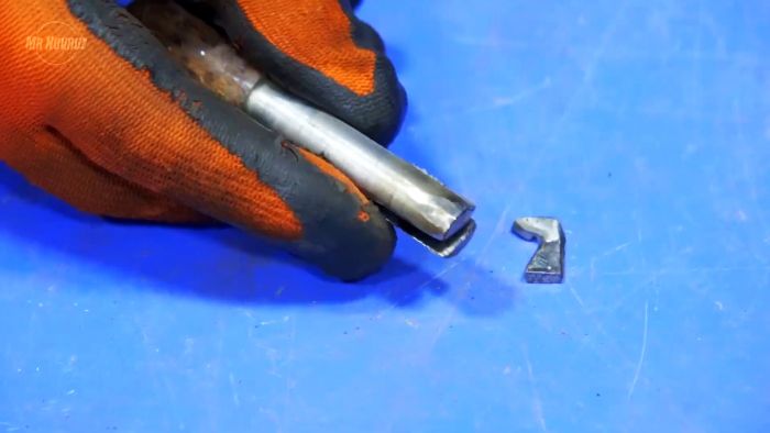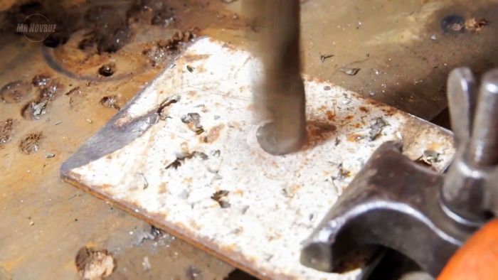 С краю разреза заготовка просверливается. В полученное отверстие приклепывается Г-образный зацеп, вырезанный с тонкой листовой стали. Толщина крюка должна быть меньшей, чем пропила в ключе, чтобы он легко складывался внутрь без трения.