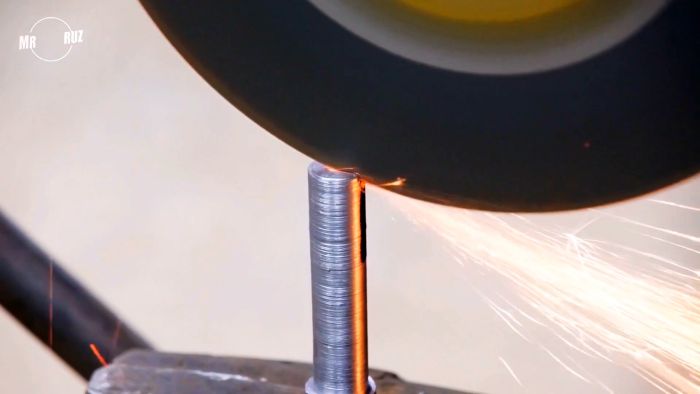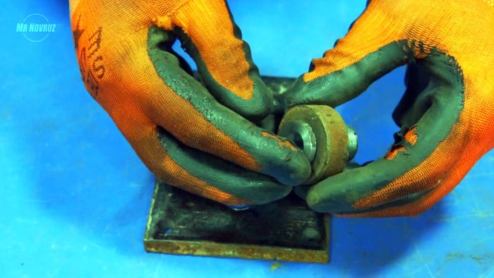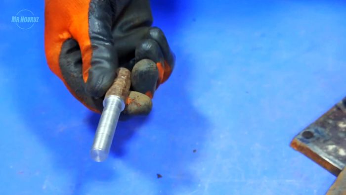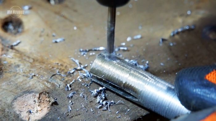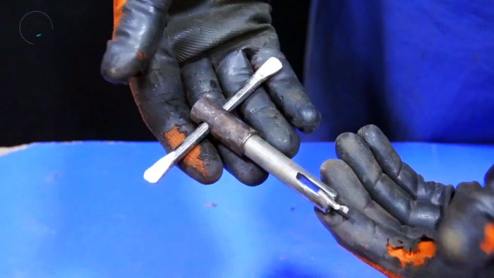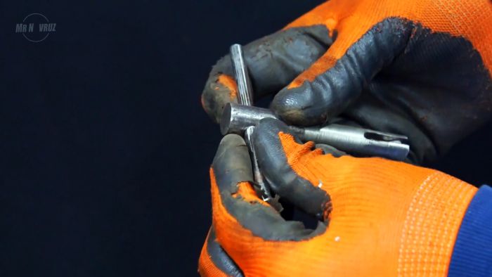 Теперь нужно заняться ключом. Он вытачивается из прутка. С одного края его диаметр стачивается так, чтобы он мог входить во вваренную втулку. С этой стороны его следует пропилить вдоль.