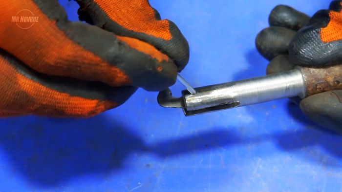 С тыльной стороны ключ просверливается, и в него вставляется пруток, края которого расклепываются. Получается удобная ручка.