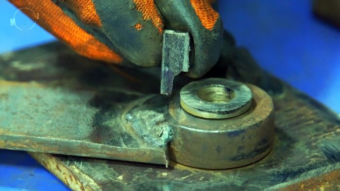 Ключ должен легко входить во втулку так, чтобы крюк на обратной стороне выпадал. Теперь нужно посмотреть его положение на шайбе, чтобы приварить в это место зацеп из прутка. Таким образом, крючок сможет в него упираться, и тем самым приподымать задвижку.