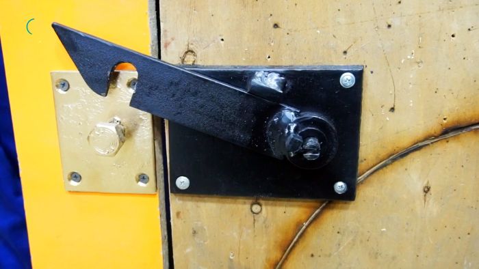 На шайбу впереди замка приваривается задвижка с полосы. Она должна выходить за пределы пластины на 70-100 мм. Ее край срезается под углом, также на ней делается пропил шириной 12 мм для входа штока ответной части замка.
