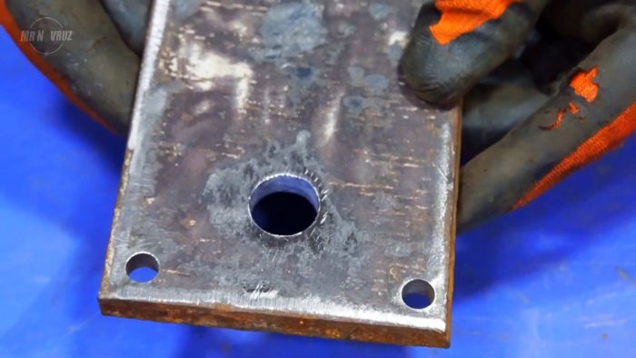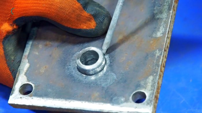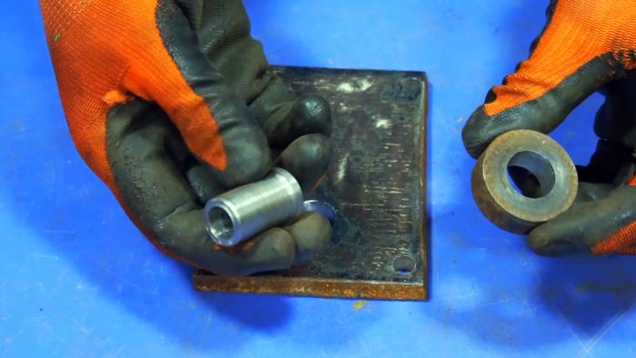 На токарном станке вытачиваете массивная шайба и пустотелая втулка со шляпкой на краю. Нужно вставить втулку через шайбу в отверстие на пластине, и приварить с обратной стороны.