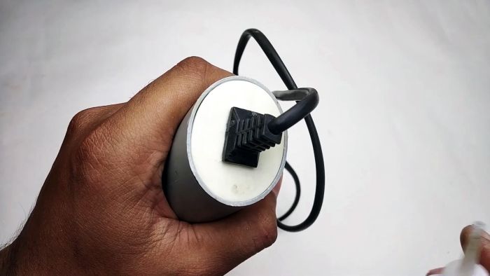 Торец трубы закрывается пластиковой или деревянной заглушкой, в которую продевается кабель с вилкой. Провода надёжно скручиваются или спаиваются и изолируются.
