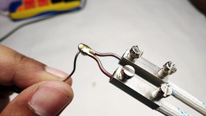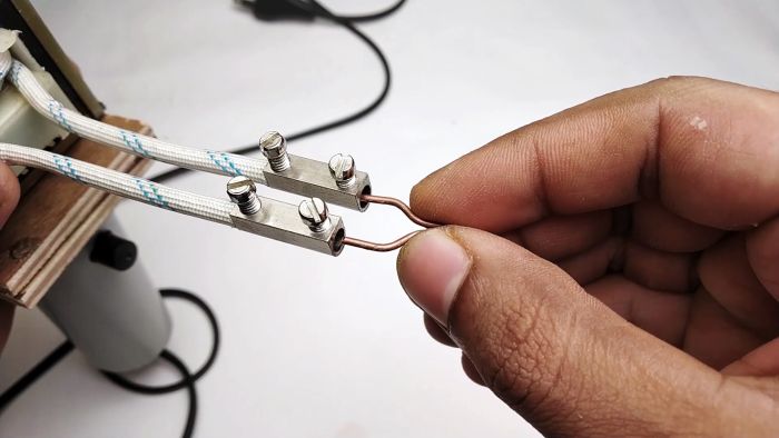 Из куска меди сгибается жало паяльника и соединяется с выходящими проводами посредством коннекторов.