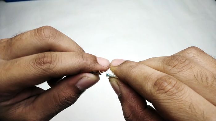 Отрезается 14 жил медного избавленного от изоляции провода длиннее полимерного рукава на 4-5 см. Они вставляются в изоляционный рукав, и тот в три витка наматывается на катушку.