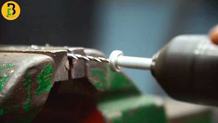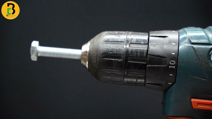 Берем необходимый болт для сверления и зажимаем его в патроне дрели. Если боитесь «загубить» резьбу, то обверните ее в несколько оборотов малярного скотча перед зажимом.