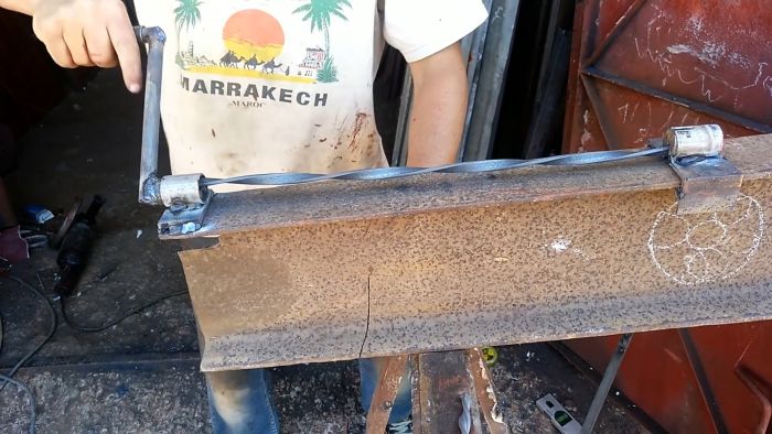 Вставляем в пропилы вставок стальную полосу, прижимая подвижный узел к заготовке, и вращаем ручку, тогда полоса постепенно трансформируется в спираль. Причем, чем больше совершено оборотов, тем гуще получится спираль.