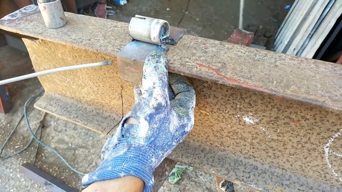 Два равных по длине фрагмента стального уголка прижимаем с двух сторон к верхней полке двутавра так, чтобы полки уголков лежали на полке двутавра и были симметричны друг другу.