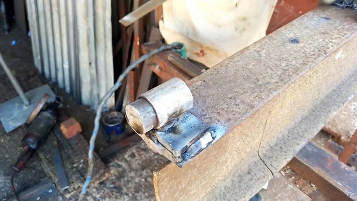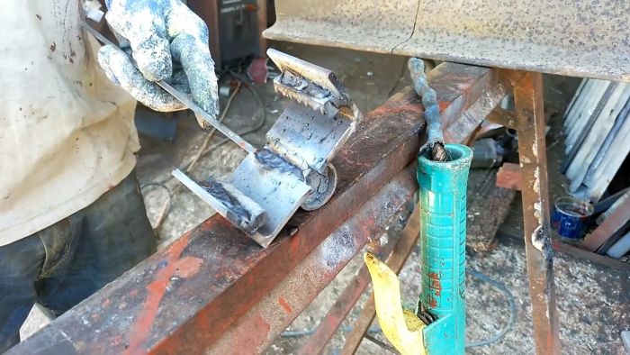 На зазор между полками уголков укладываем продольно отрезок трубы с вваренной в него вставкой так, чтобы пропил был ориентирован по вертикали и привариваем его к уголкам, причем этот узел должен свободно перемещаться по полке двутавра.