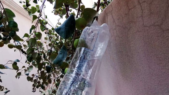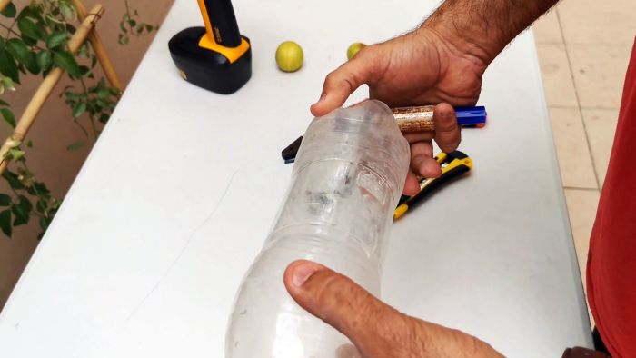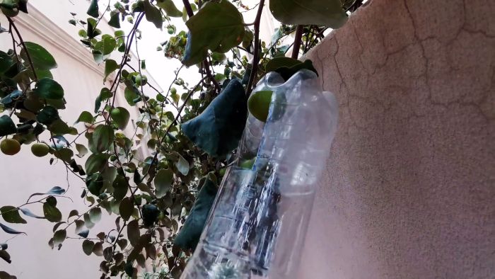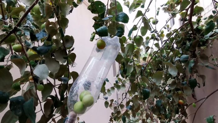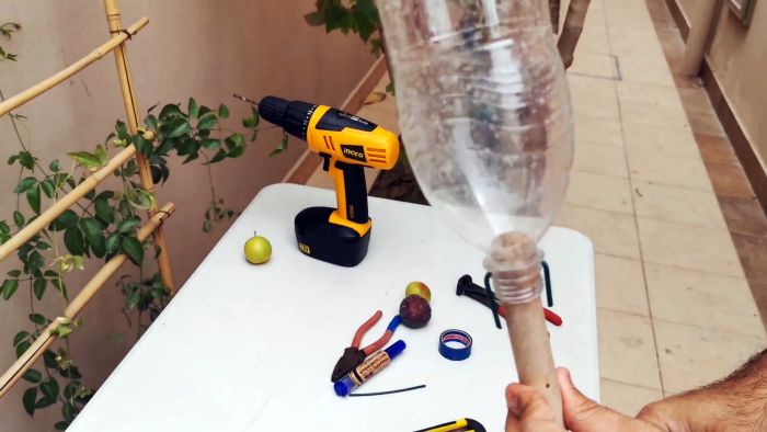 - ПЭТ бутылка. Выбирайте ее размер в зависимости от размера плодов, какие вам предстоит собирать.