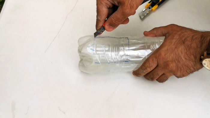 Берем бутылку и отклеиваем у нее все этикетки. Далее маркером рисуем окно с треугольников в верху дна. Этот треугольник как раз и будет помогать срывать плод с дерева.