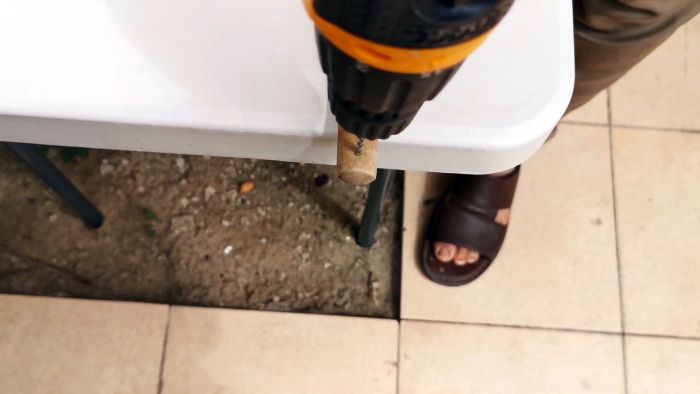 Вырезаем это окно при помощи канцелярского ножа. Далее берем деревянный черенок от швабры или другого инструмента и на конце сверлим сквозное отверстие.