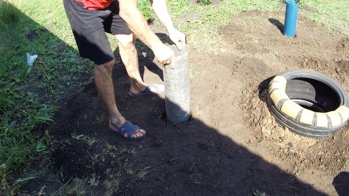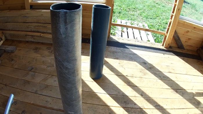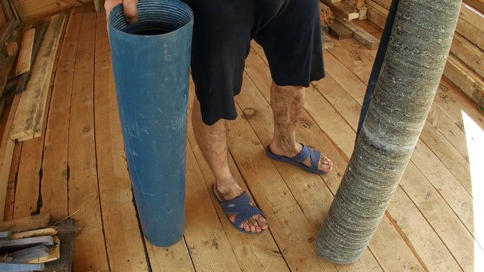 Для изготовления опалубки под один столбик, потребуется отрезать от рулона рубероида кусок длиной 2 м. Он наматывается на пластиковую трубу, но не в натяжку, чтобы ее можно было потом вытащить.