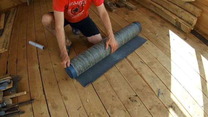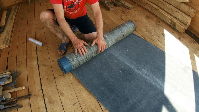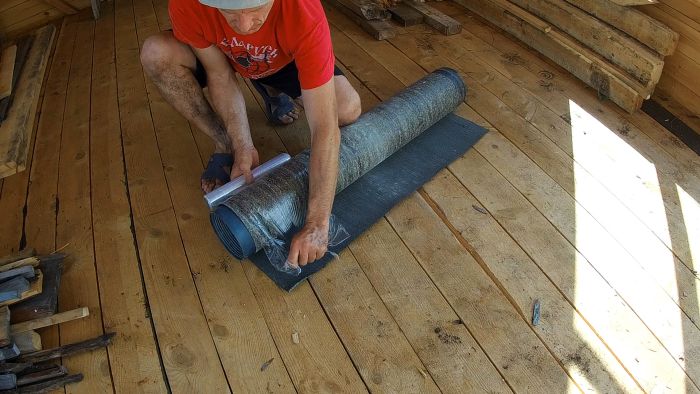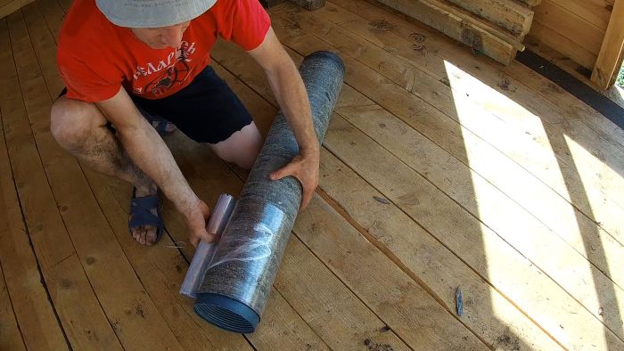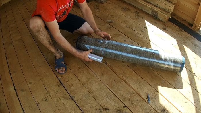 Домотав рубероид практически до конца, нужно положить под его край конец пищевой пленки. Чтобы та держалась, на ней нужно собрать небольшой комок, который сожмется рубероидом. Затем пленка наматывается на заготовку, но в противоположном направлении. Требуется сделать несколько слоев без пропусков, полностью окутав сверток.