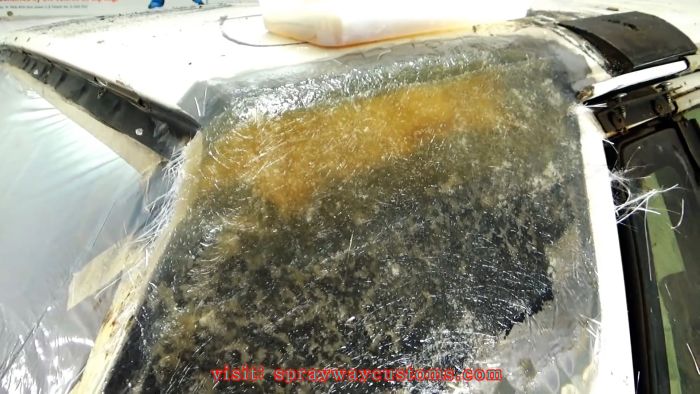 Если очаг ржавчины находится близко к стеклу, его лучше снять, а проем закрыть пленкой с помощью скотча. Предварительно зону работы необходимо очистить от пыли и грязи, промыть хотя бы мыльной водой и хорошенько просушить. Очищаем очаг сквозной коррозии и его окрестности болгаркой с наждачным диском и заканчиваем дрелью с проволочным диском.