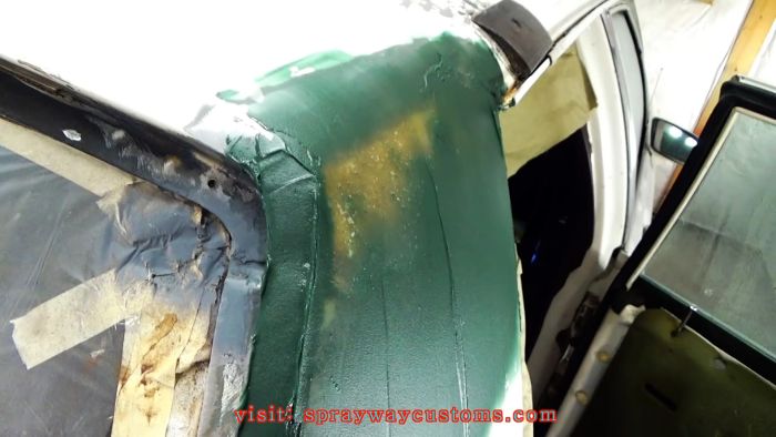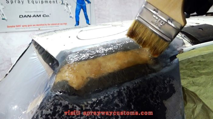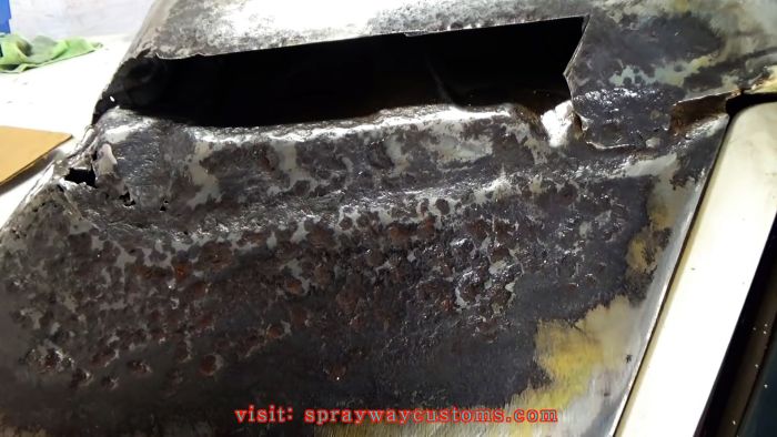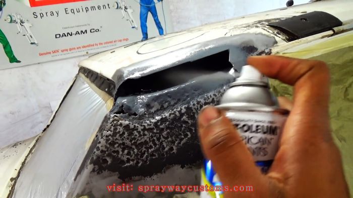 Оставшиеся очаги коррозии удаляем с помощью белого уксуса и скотч-брайта. Завершаем эту операцию обильной промывкой чистой водой. Наносим на очаг коррозии с небольшим припуском в два слоя аэрозольную грунтовку и даем ей высохнуть.