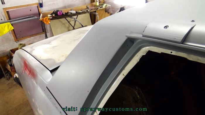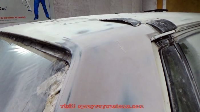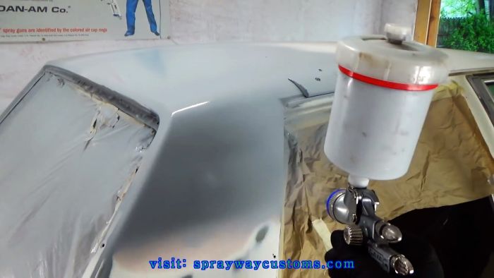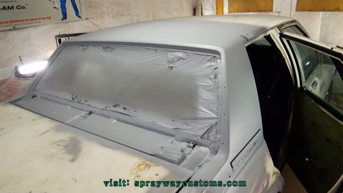 С помощью краскопульта покрываем восстанавливаемый участок кузова и прилегающие районы жидкой грунтовкой, а затем и краской, предварительно прикрыв не грунтуемые поверхности бумагой, пленкой и т. д.