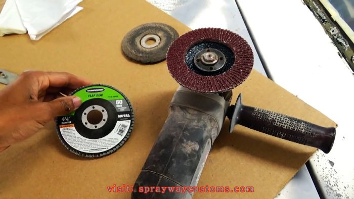 Инструменты и приспособления: болгарка, дрель, наждачная бумага Р80-Р1200, белый уксус, скотч-брайт или матерчатая салфетка, нож с тонким и острым лезвием и краскопульт.