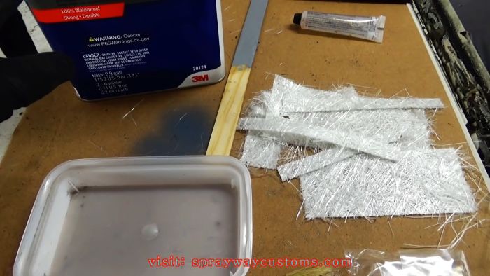 На высохшую смолу наносим еще слой из нее и укладываем полоски стекловолокна в два-три или более слоев для выравнивания поврежденного участка кузова с окружающими участками, каждый раз пропитывая их стекловолоконной смолой.