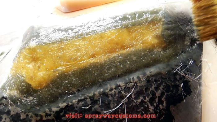 Оставшиеся дефекты заполняем стекловолоконным наполнителем и после его высыхания обрабатываем наждачной бумагой, придавая поверхности нужную форму.