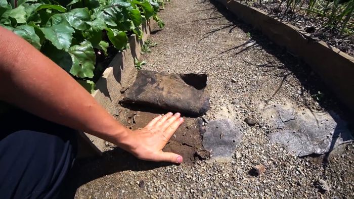 Этот способ создания дорожек подходит как нельзя лучше именно для переходов между грядками, так как их бортики существенно упрощают весь процесс. Необходимо просто расстелить рубероид, и засыпать его песком. Чтобы вода на такой мульчи не задерживалась, его необходимо проколоть вилами по всей длине. Можно использовать даже старый рубероид, сорванный с крыши. Он просто укладывается лоскутами. В таком случае даже не придется его прокалывать, вода будет уходить сквозь щели.