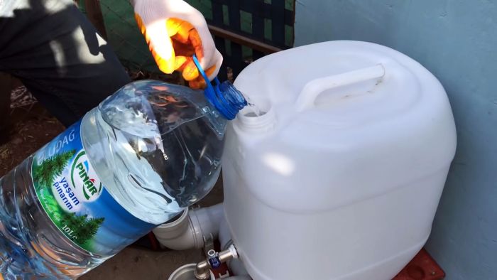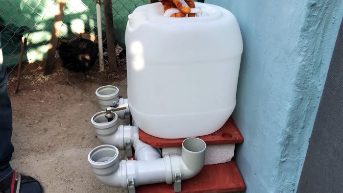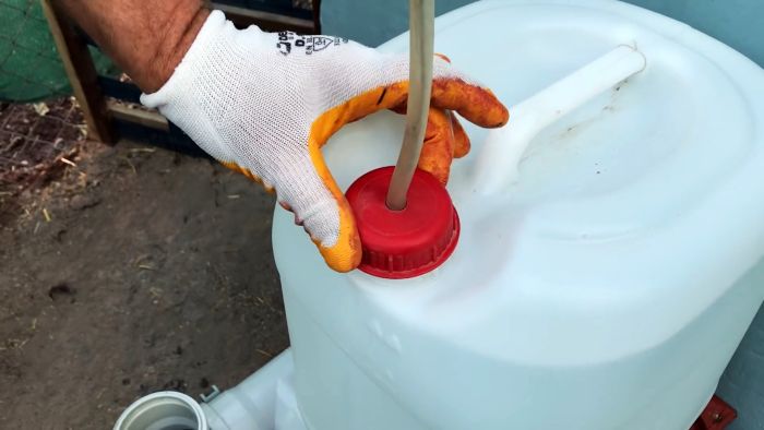 Канистра заполняется водой. В ее крышке пробивается отверстие, и в него плотно вставляется отрезок шланга. Его второй конец нужно прижать стяжкой или привязать к крану.