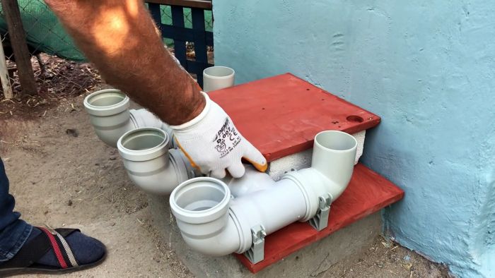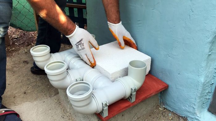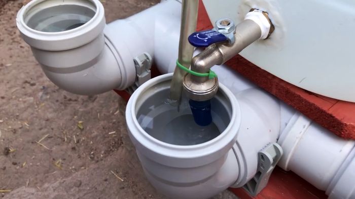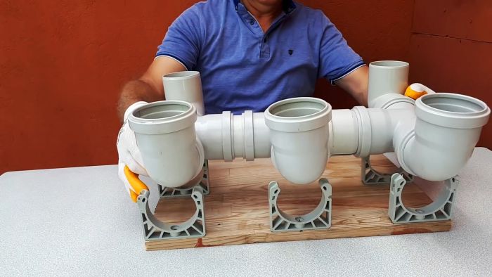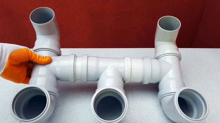Далее необходимо собрать из колен и тройников конструкцию для поения птиц. Ее боковые элементы состоят из тройников с подсоединенной парой колен. Между собой они соединяются через третий тройник, боковой выход которого оборудован пятым коленом. Чтобы стыковать центр с крайними элементами с одной стороны используется простой обрезок трубы, а с другой ее раструб.
