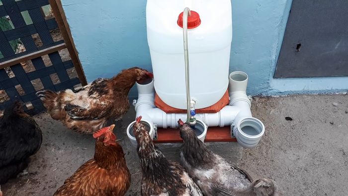 Теперь нужно установить на нее подставку и канистру. Последняя должна расположить выше поилки. Чтобы вода с канистры вытекала, требуется установить в ее стенку врезку с краном.