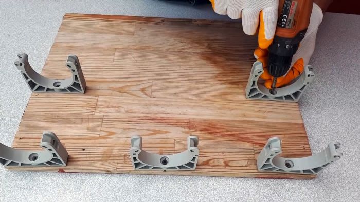 Из фанеры или мебельного щита нужно выпилить основание под поилку размером 48х38 см. К нему прикручиваются хомуты крепления, как показано на фото. Нужно разместить 3 клипсы в ряд под краем, и за ними по бокам еще по одной.