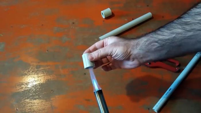 Затем разжигается горелка, и на ней выставляется минимальная сила факела. Под ним разогревается изнутри фитинг. Нельзя держать пламя в одной точке, нужно его вращать.