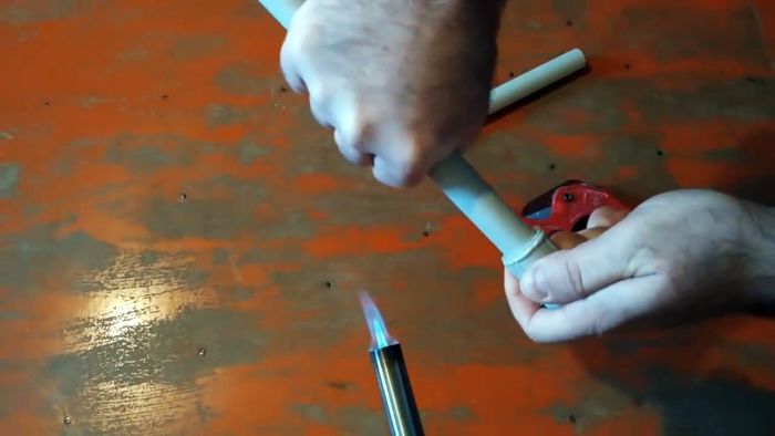 Затем к пламени сбоку подноситься труба, и ее край на 15-20 мм разогревается. Следует ее вращать, обеспечивая равномерный набор температуры. Греть нужно пока ее край не начнет оплавляться, но до почернения и воспламенения полипропилена.