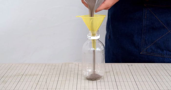 Теперь в небольшую ПЭТ бутылку набирается сухой просеянный песок, и она заворачивается в крышку на пистолете.