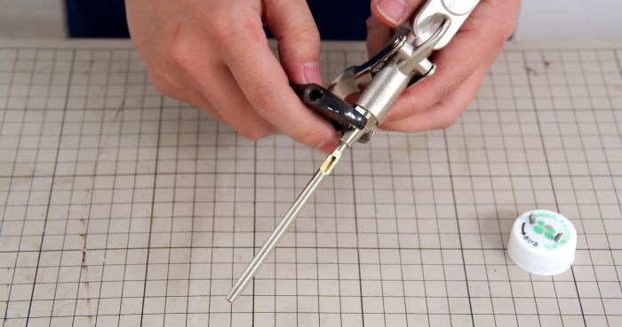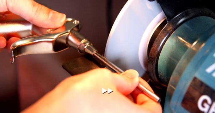 Необходимо проточить стенку трубки продувочного пистолета сверху, ближе к его корпусу. Ширина полученного отверстия должна получиться примерно 6-8 мм.