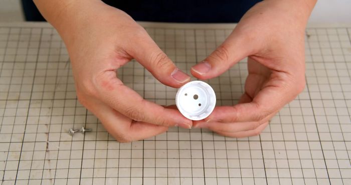 Далее нужно просверлить крышку от ПЭТ бутылки сверлом 3 мм. Отверстие делается с небольшим смещением от центра. По краям крышки делается 2 отверстия сверлом 1 мм.
