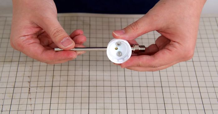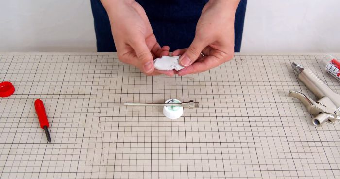 В боковые отверстия в крышке изнутри вставляется 2 самореза. Далее нужно зачистить до шероховатости трубку продувочного пистолета возле проточенного отверстия.