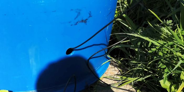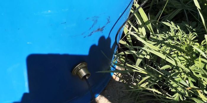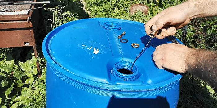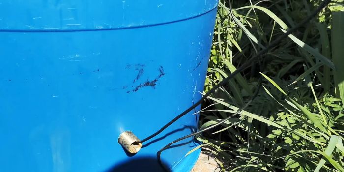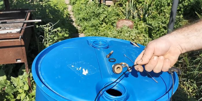 В баке необходимо просверлить отверстие для врезки крана. Полученные в результате сверления заусенцы обрабатываются. Далее на длинном одножильном проводе делается петля на затяжку. Края провода от нее в две стороны должны быть хотя бы немного длиннее, чем высота бака. Затем в петле затягивается болт.