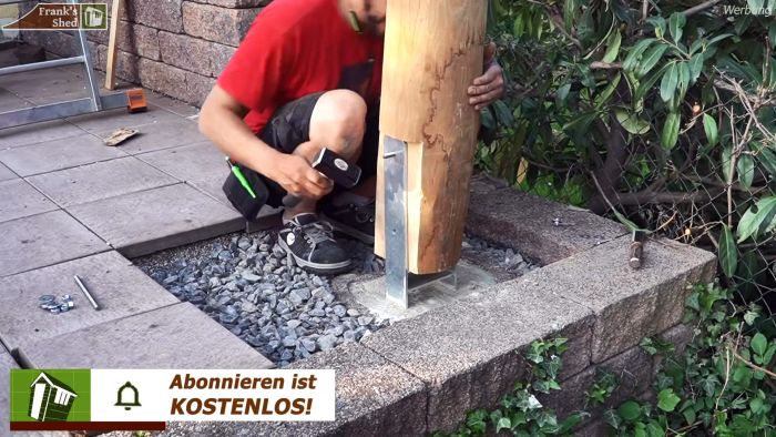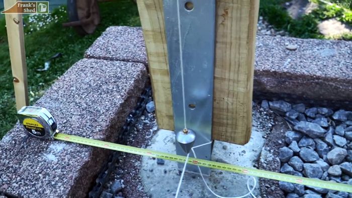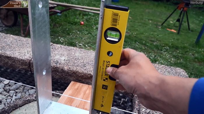 Обратите внимание, что запиливать столб нужно так, чтобы до перемычки скобы оставалось 3-5 см. Он должен как бы висеть на стойках, а не упираться низом. Это предотвратит намокание древесины и ее гниение.